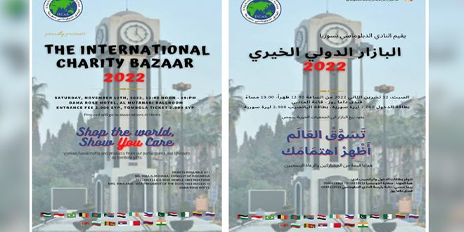 بمشاركة 21 دولة يقيم النادي الدبلوماسي في سورية، بالتعاون مع وزارة الشؤون الاجتماعية والعمل البازار الدولي الخيري لعام 2022 ، وذلك في الـ 12 من الشهر الجاري بفندق الداما روز بدمشق.