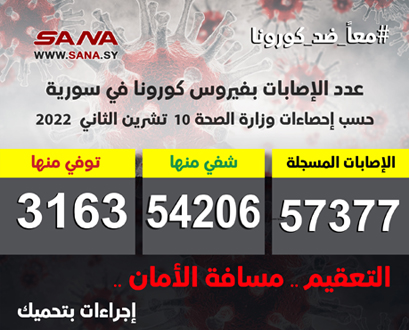 وأوضحت الوزارة في بيان تلقت سانا نسخة منه أن عدد الإصابات المسجلة في سورية بلغ حتى الآن 57377 شفيت منها 54206 حالات وتوفيت 3163 حالة.
