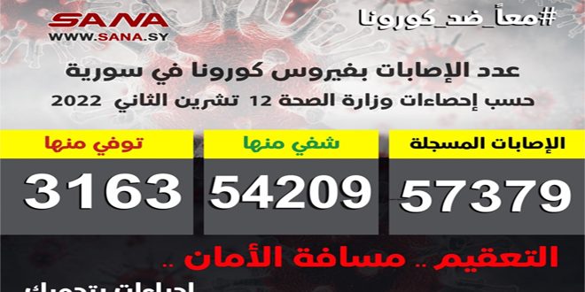 وأوضحت الوزارة في بيان تلقت سانا نسخة منه أن عدد الإصابات المسجلة في سورية بلغ حتى الآن 57379، شفي منها 54209 حالة، وتوفي 3163 حالة.