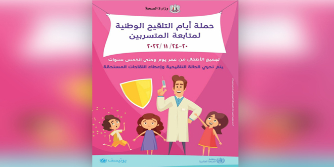 تطلق وزارة الصحة الأحد القادم حملة أيام التلقيح الوطنية لمتابعة الأطفال المتسربين من التلقيح، من عمر يوم حتى 5 سنوات وتستمر حتى الـ 24 من الشهر الجاري.