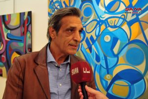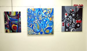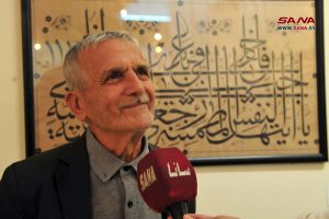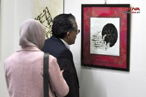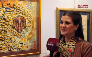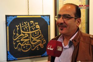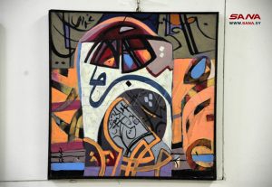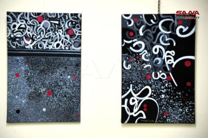 الفنان التشكيلي خلدون الأحمد القادم من حلب قدم خمسة أعمال حروفية ضمن توجهه الحروفي الذي يحتفي من خلاله بالحرف العربي بريشته الفنية وتكويناته الجمالية وكأنه عزف موسيقي بالخط واللون.
