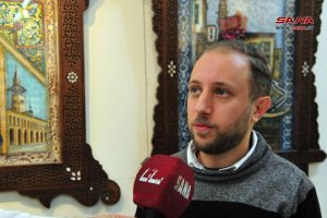 وجسد الفنان الشاب علاء الغبرة عمق انتمائه لمدينة دمشق بثلاث لوحات دمج فيها الخط العربي بالرسم والزخرفة بتقنية الألوان المائية والأكريليك والأحبار مع إطارات خشبية مطعمة بالصدف من صنع يده أيضاً.