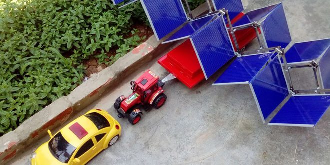 بهدف توفير الطاقة الكهربائية في الأراضي الزراعية لسقايتها دون استهلاك كمية من المازوت لتشغيل المولدات، تمكن مهندس المعلوماتية الشاب أحمد الزعبي من اختراع وتصميم عربة لتوليد الكهرباء بالطاقة الشمسية.