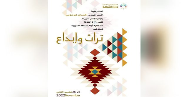 تنطلق يوم غد فعاليات احتفالية أيام الثقافة السورية تحت عنوان (تراث وإبداع)، متضمنة برنامجاً ثقافياً منوعاً أعدته المديريات والمؤسسات التابعة لوزارة الثقافة، احتفالاً بذكرى تأسيسها الـ 64 على امتداد الجغرافيا السورية.