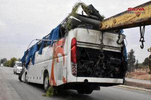 وأوضح رئيس فرع المرور في حماة العقيد وليد العجيلي في تصريح لمراسل سانا أن حافلة نقل ركاب متجهة إلى محافظة حلب انحرفت عن مسارها، وتدهورت بجانب أوتوستراد حماة – حلب، بالقرب من موقع محطة وقود اتحاد الفلاحين، مشيراً إلى أن تدهور وانقلاب الحافلة أسفر عن وفاة 4 أشخاص وإصابة 25 آخرين بجروح، من بينهم واحد إصابته خطيرة والباقي تفاوتت إصاباتهم بين الخفيفة والمتوسطة، وجميعهم كانوا على متن الحافلة وتم إسعافهم فور وقوع الحادث إلى مشفى حماة الوطني لتلقي العلاج.