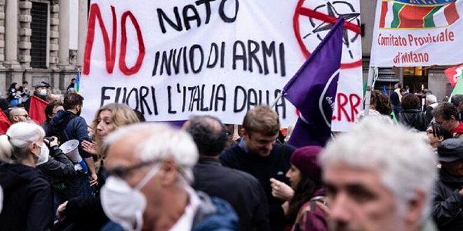 تظاهر مئات الأشخاص اليوم وسط مدينة ميلانو الايطالية احتجاجا على توريد الأسلحة للنظام الاوكراني، مطالبين بإلغاء العقوبات الغربية ضد روسيا التي انعكست على الحياة المعيشية للإيطاليين.