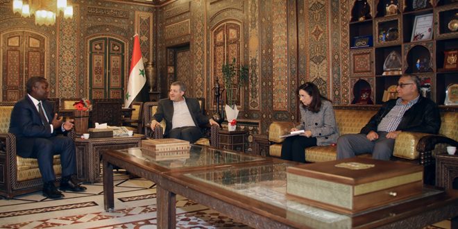 بحث محافظ دمشق المهندس محمد طارق كريشاتي مع مدير شؤون وكالة الأمم المتحدة لإغاثة وتشغيل اللاجئين الفلسطينيين (أونروا) في سورية أمانيا مايكل إيبي تعزيز التعاون والجهود المبذولة لتأمين عودة المهجرين إلى منازلهم في مخيم اليرموك ومشاريع تأهيل البنى التحتية التي يمكن تنفيذها في المرحلة القادمة والتوسع بالخدمات المقدمة.