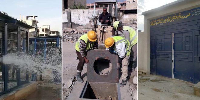 وذكر رئيس المجلس أن العمل جار على استكمال تأهيل خطوط الصرف الصحي في الشوارع الرئيسية في حي تشرين بالتعاون مع منظمة الإسعاف الأولي الدولية فيما أنهت منظمة الصليب الأحمر الدولية تنفيذ مشروع صيانة واستبدال خط الصرف الصحي المار بمدينة الحجر الأسود وصولاً لمنطقة القدم باتجاه محطة ضخ اليرموك بطول 1800 متر كما تم تأهيل جزء من خط الصرف الصحي بحي الثورة في المدينة.
