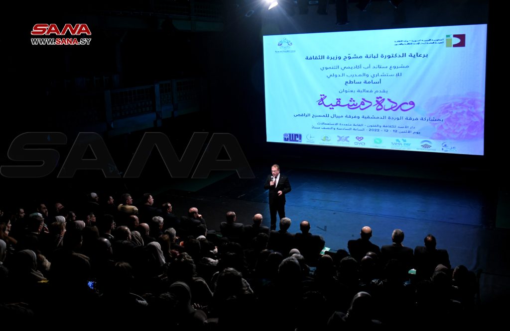 وتضمنت الفعالية التي جاءت بإشراف الاستشاري والمدرب الدولي أسامة ساطع عروضاً لفرقة الوردة الدمشقية، وندوة حوارية تفاعلية مع مجموعة من الشخصيات الثقافية والإعلامية والاقتصادية حول الأسس والقيم الأخلاقية البناءة وكيفية إعادة تمكينها في جيل الشباب، تلاها عدد من العروض الغنائية الراقصة لفرقة ميرال للرقص المسرحي.