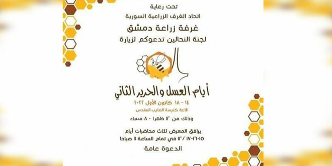 بمشاركة 41 نحالاً ومصدراً وشركات زراعية وبيطرية ومصارف وشركات تعبئة وتغليف وشحن وتصدير من القطاعين العام والخاص، تنطلق غداً فعاليات مهرجان “أيام العسل والحرير الثاني” الذي تنظمه غرفة زراعة دمشق، بالتعاون مع وزارة الزراعة والإصلاح الزراعي، وذلك في صالة كنيسة الصليب بالقصاع.