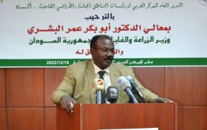 وقدم الدكتور العبيد خلال اللقاء عرضاً عن خطط وبرامج المركز لدعم جهود الدول العربية في التنمية المستدامة وخاصة في السودان، مؤكداً استعداد “أكساد” لوضع كل إمكانياتها وخبراتها في خدمة برامج ومشاريع وزارة الزراعة والغابات السودانية، بما يلبي طموحاتها وخططها المستقبلية لتنمية القطاع الزراعي فيه.