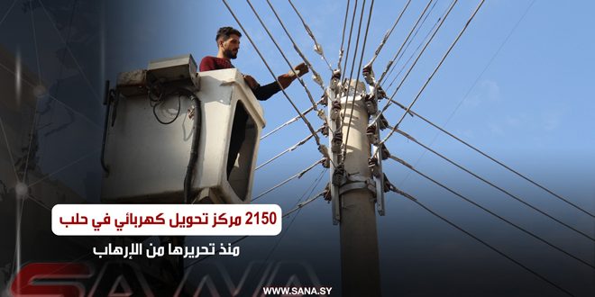 وضع 2150 مركز تحويل كهربائي بالخدمة في حلب منذ تحريرها من الإرهاب