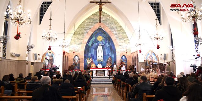 وأشار الأب توما في عظته إلى معاني الميلاد السامية والكبيرة وقيمه التي تدعو إلى المحبة والخير والسلام والدعاء لتكون أيام سورية القادمة أفضل، مؤكداً أننا وبفضل شهداء الجيش العربي السوري الباسل الذين ضحوا بدمائهم الطاهرة نحيا أحرارا على ثرى وطننا المقدس.
