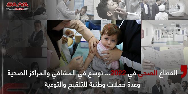 شهد القطاع الصحي خلال العام 2022 توسعاً في افتتاح مشاف ومراكز صحية وأقسام جديدة، إضافة إلى تطوير البنى التحتية للمشافي والمراكز الصحية التابعة له في جميع المحافظات ورفدها بالأجهزة الطبية، والعمل على تأمين الأدوية، إضافة لحملات التلقيح الوطنية وحملات التوعية الصحية.