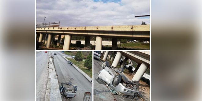 أصيب شخصان بجروح اليوم جراء تدهور سيارة سياحية على جسر مشروع دمر بمدينة دمشق.