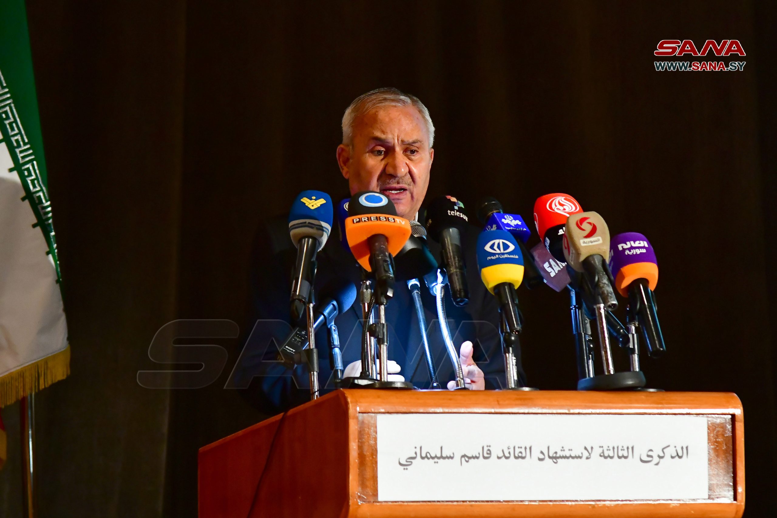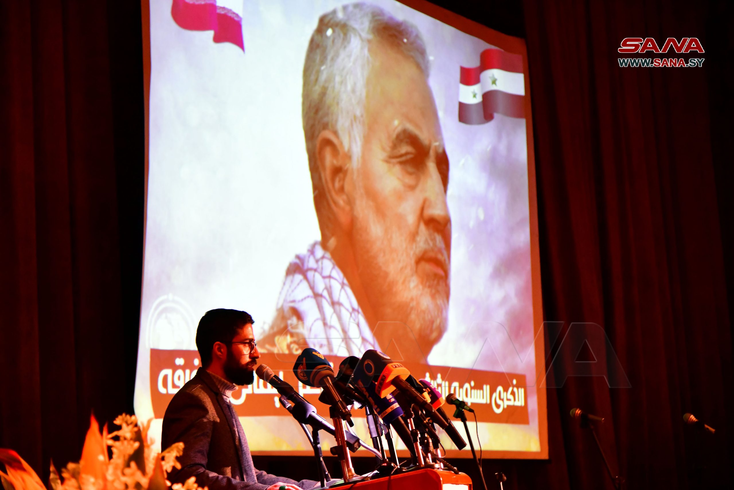 من جهته أكد السفير الإيراني بدمشق مهدي سبحاني في كلمة له أن إحياء ذكرى استشهاد سليماني هو إحياء لمدرسة وفكر ومبدأ، لكون نهجه مصباحاً يهتدي به جميع المناضلين الذين يبذلون الغالي والنفيس من أجل تحقيق الحرية والشرف والاستقلال لأوطانهم، مؤكداً أن اغتيال الشهيد سليماني لن يقضي على أهدافه ومبادئه السامية مهما طال الزمن.