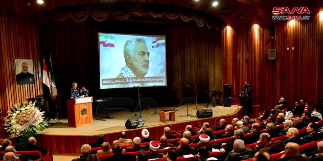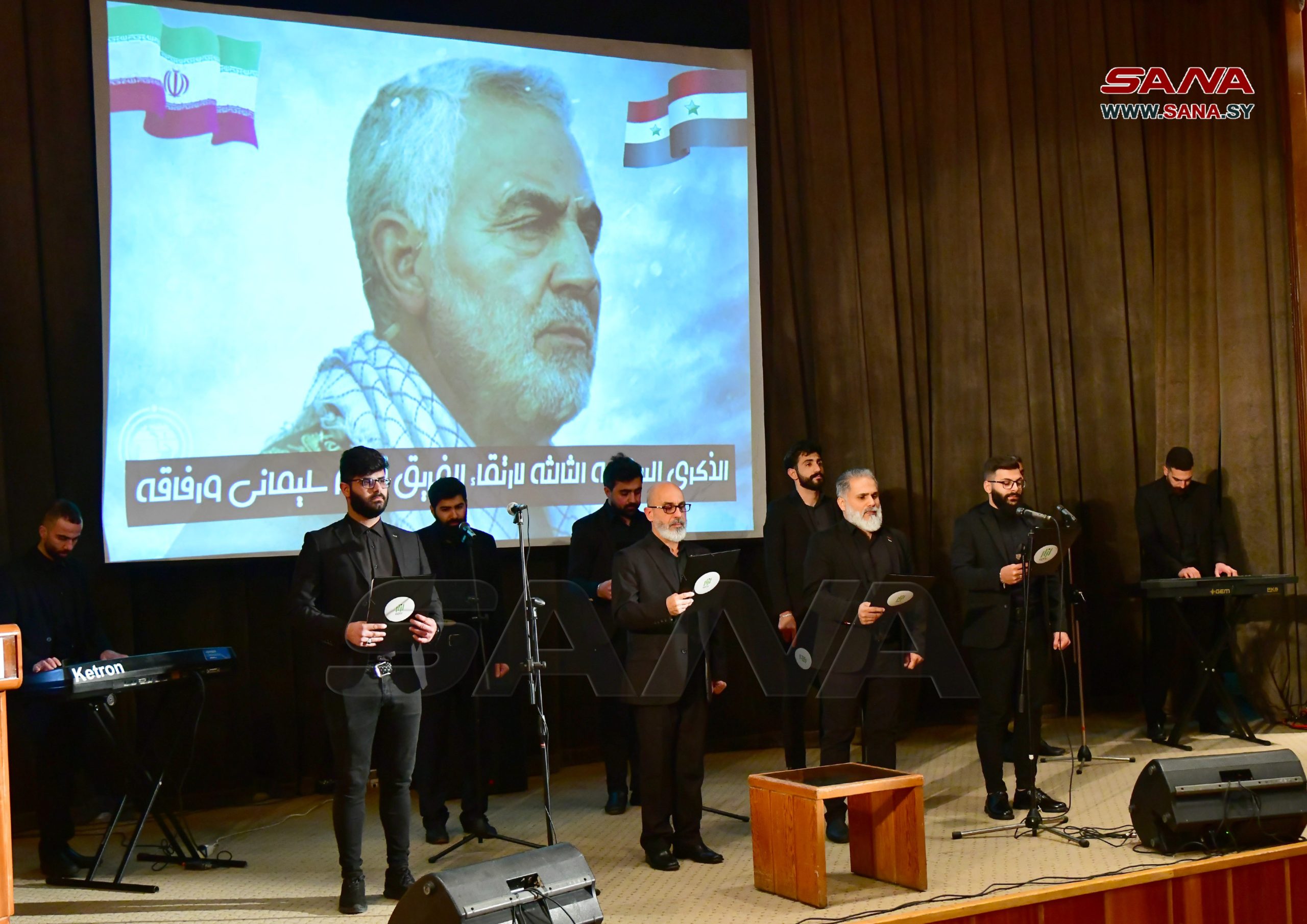 أحيت السفارة الإيرانية بدمشق اليوم الذكرى السنوية الثالثة لاستشهاد الفريق قاسم سليماني ورفاقه، من خلال فعالية بعنوان (سيبقى خالداً)، وذلك في مكتبة الأسد الوطنية بدمشق.