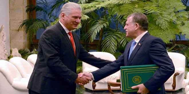 وأشاد الرئيس الكوبي بالبطولات التي حققتها سورية شعباً وجيشاً وحكومة في التصدي للإرهاب الممنهج والمدعوم من الغرب، وعبر عن تقديره للمواقف المشرفة لسورية في المحافل والمنظمات الدولية، والدعم المستمر الذي تتلقاه كوبا من سورية.