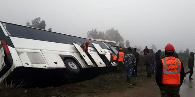وذكر مصدر في فرع الدفاع المدني بحمص لمراسل سانا أن غرفة عمليات الفرع تلقت نداء استغاثة حول تدهور حافلة نقل ركاب بالقرب من مقر الشركة السورية للغاز على طريق تحويلة دمشق حماة، وعلى الفور تحرك العناصر إلى المكان، وعملوا بالتعاون مع شرطة المرور على إخراج الركاب المحاصرين داخل الحافلة وإسعاف المصابين إلى المشفى وتأمين الطريق.
