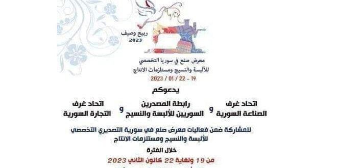 تنطلق غداً الخميس فعاليات معرض صنع في سورية التصديري التخصصي للألبسة الجاهزة والنسيج ومستلزمات الإنتاج “صنع في سورية” ربيع وصيف 2023 الذي ينظمه اتحاد غرف الصناعة السورية ورابطة المصدرين السوريين للألبسة والنسيج واتحاد غرف التجارة السورية، بالتعاون مع وزارتي الاقتصاد والتجارة الخارجية والصناعة، وذلك على أرض مدينة المعارض الجديدة في دمشق.