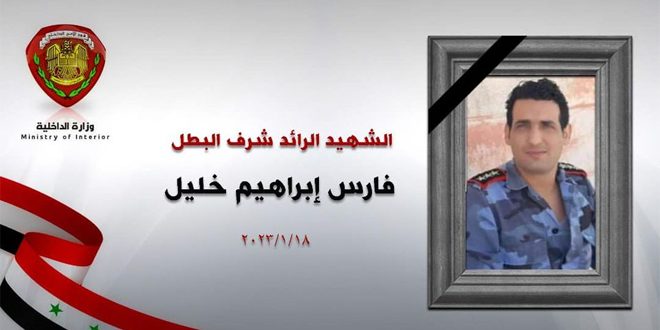 وقالت الوزارة في بيان لها اليوم تلقت سانا نسخة منه: استشهد الرائد شرف فارس خليل من مرتبات وحدة المهام الخاصة في دمشق، وأصيب كل من الشرطيين محمد ذياب وفادي حمادي من مرتبات وحدة المهام الخاصة في درعا وثلاثة مدنيين، وذلك جراء انفجار عبوة ناسفة في ساحة بصرى بمدينة درعا، بالتزامن مع مرورهم بالقرب منها أثناء تأدية واجبهم الوطني.