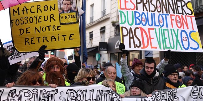 تظاهر آلاف الفرنسيين في باريس اليوم للاحتجاج على مشروع الرئيس الفرنسي إيمانويل ماكرون لتعديل نظام التقاعد.