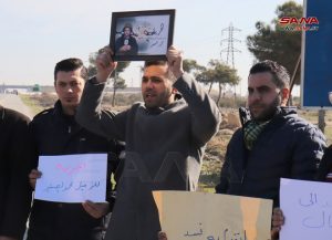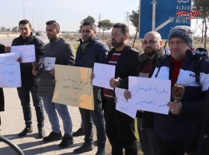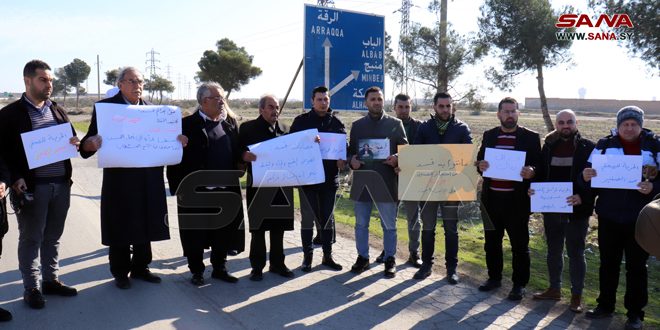 وناشد الإعلاميون المشاركون في الوقفة العشائر العربية الموجودة شرق حلب لاتخاذ موقف مشرف بإنقاذ البلاد من ممارسات ميليشيا (قسد) وسرقاتها مع المحتل الأمريكي لثروات الوطن، ولا سيما النفط والقمح وحرقها للمحاصيل الزراعية، إضافة إلى ترويعها المواطنين من جهة أخرى.