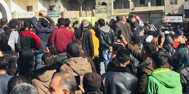 وذكرت مصادر محلية لمراسل سانا أن المئات من أهالي مدينة الرقة تجمعوا عند دوار النعيم للتنديد بميليشيا (قسد)، وانتهاكاتها وممارساتها الترهيبية، ولا سيما تسترها مؤخراً على مجرمين أقدموا على قتل امرأة وطفلتها في حي المشلب.