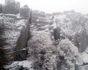 تساقطت الثلوج على قمة جبل شمس في سلطنة عمان في حدث نادر إثر منخفض جوي تمر به البلاد.