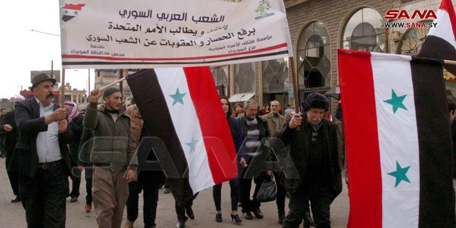 نظم فرع مؤسسة ملتقى الأسرة السورية في محافظة السويداء اليوم فعالية وطنية أمام مجلس المدينة، شاركت فيها فعاليات أهلية وشبابية ورسمية تنديداً بالحصار الجائر المفروض على الشعب السوري، وتضمنت توقيع وثيقة لمطالبة الأمم المتحدة والمجتمع الدولي بالتحرك الفاعل، لرفع العقوبات القسرية أحادية الجانب المفروضة على الشعب السوري.