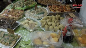 وتم عرض منتجات من المشغولات اليدوية التراثية من الألبسة والمطرزات والأعمال الخشبية واللوحات الفنية وبعض أنواع الحلويات والمأكولات.