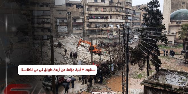 سقوط 3 أبنية مؤلفة من 4 طوابق في حي الكلاسة جراء الزلزال الذي ضرب سورية فجر اليوم