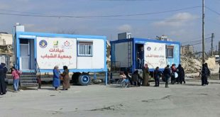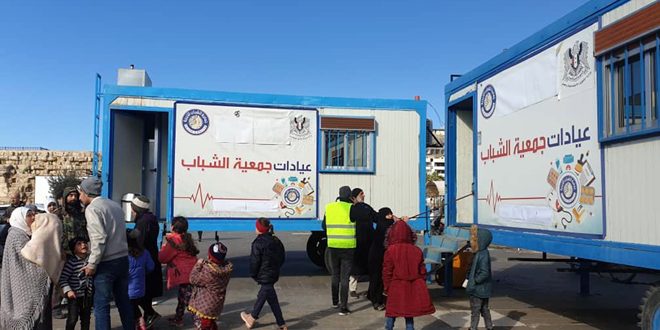 بالتعاون مع محافظة دمشق أرسلت جمعية الشباب الخيرية بدمشق عيادتين طبيتين متنقلتين إلى مدينة جبلة، لدعم جهود القطاع الصحي في علاج المصابين من جراء الزلزال الذي ضرب عدداً من المحافظات السورية فجر الإثنين الماضي.