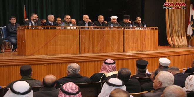 مدير الأوقاف أحمد الصيادي قال: إن أهل حوران جزء من هذا الوطن واختار أبناؤها الثبات فيه ويعملون اليوم كأسرة واحدة لمساعدة الأهل في المحافظات المتضررة، كما يناشدون المجتمع الدولي لكسر الحصار المفروض على الشعب السوري.