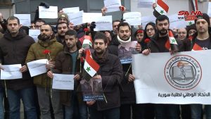 ورفع الطلبة المشاركون شعارات ورددوا هتافات تدعو إلى رفع الحصار الغربي الجائر المفروض على سورية، لافتين إلى حاجتها للمواد الغذائية والطبية والأدوية والآليات الهندسية الثقيلة لرفع الأنقاض وحطام الأبنية للإقلال من عدد الضحايا وإنقاذ ما يمكن إنقاذه.