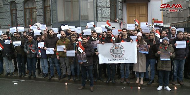نظم فرع الاتحاد الوطني لطلبة سورية في روسيا مع زملائهم الروس وقفة تضامنية اليوم أمام مقر السفارة السورية في موسكو للتضامن مع وطنهم بعد الزلزال الذي تعرضت له.