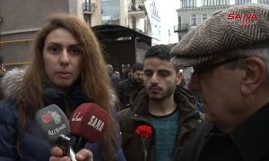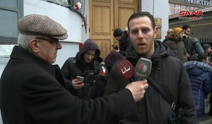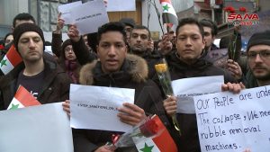 وقال طالب روسي: :”إننا نقف هنا من أجل مطالبة كل البلدان الغربية برفع الحصار والعقوبات الجائرة عن سورية”، مضيفاً: “إن المساعدات الإنسانية التي وصلت سورية كانت من البلدان الصديقة والعربية ولم تصل أي مساعدات من أي بلد أوروبي، لذا إننا نطالب برفع العقوبات عن سورية”.