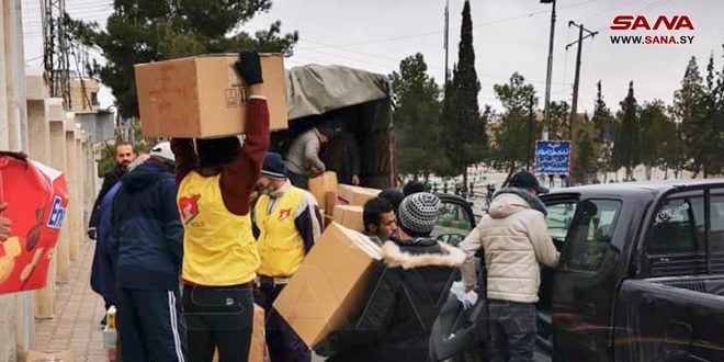 سير أهالي مدينة يبرود اليوم خمس شاحنات من المساعدات الإغاثية المتنوعة وحافلة تحمل كوادر بشرية لمساعدة المتضررين من الزلزال في مدينة جبلة بمحافظة اللاذقية.