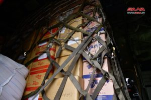 وذكر مدير المطار المهندس زياد الطويل لمراسل سانا أن الطائرة تحمل على متنها 32 طناً من المواد الغذائية والخيم.