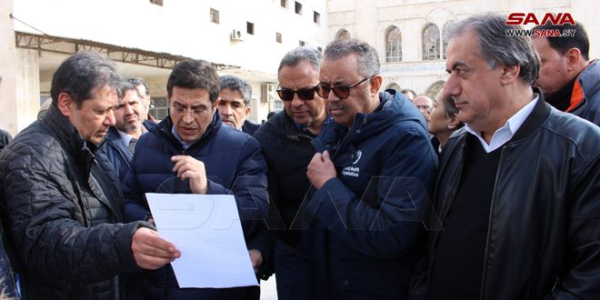 اطلع مدير عام منظمة الصحة العالمية الدكتور تيدروس أدهانوم غيبريسوس برفقة وزير الصحة الدكتور حسن الغباش ومحافظ حلب حسين دياب على عدد من الأحياء المتضررة جراء الزلزال الذي ضرب مدينة حلب الإثنين الماضي، وعلى أعمال إزالة الأنقاض والبحث عن ناجين في كل من أحياء الشعار والحلوانية وسد اللوز وجورة عواد والمواصلات القديمة وبستان الباشا والمشارقة.