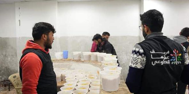 رئيس الفريق محمد الجدوع بين لمراسلة سانا أنه تم جمع المساعدات والتبرعات وتجهيز مطبخ ميداني في مدينة حلب تضمن إعداد وجبات طعام متكاملة للمتضررين المتواجدين، ضمن الجوامع والمدارس.