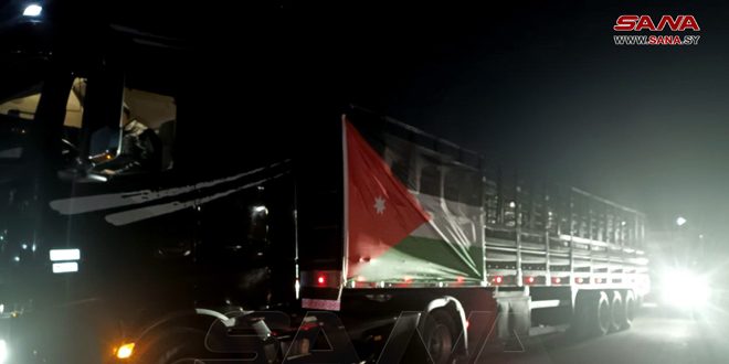 دخلت مساء اليوم قافلتان إغاثيتان مقدمتان من الحكومة الأردنية عبر معبر نصيب الحدودي، محملتان بـ 180 طناً من المواد الإغاثية للمتضررين من الزلزال في سورية.