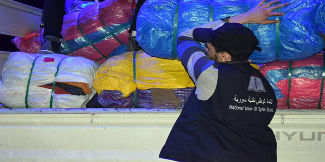 المتطوع أحمد الكحيلات عضو قيادة فرع جامعة الحواش الخاصة للاتحاد الوطني لطلبة سورية قال: تم التنسيق مع جامعة حلب منذ الانطلاقة من معبر الدبوسية للإشراف على توزيع محتويات القافلة، التي تضم 2.3 طن من المساعدات على مراكز الإيواء في المحافظة، لافتاً إلى أهمية المبادرات التطوعية في مثل هذه الأزمات، وإلى فاعلية ودور كوادر الاتحاد الوطني لطلبة سورية والتي هي منظمة شعبية طلابية ترعى العمل التطوعي للشباب وتوجهه في المكان الصحيح لخدمة المجتمع والوطن.