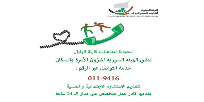 خصصت الهيئة السورية لشؤون الأسرة والسكان رقماً هاتفياً للتواصل عبره لتقديم الاستشارة الاجتماعية والنفسية للمتضررين من الزلزال.