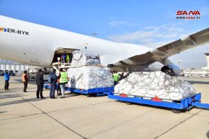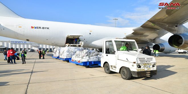 وصلت اليوم طائرة صينية إلى مطار دمشق الدولي محملة بالمساعدات الإغاثية لمساعدة المتضررين من الزلزال.