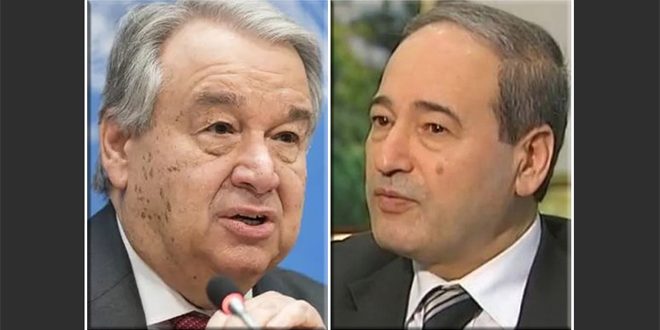 ووضع غوتيريش الوزير المقداد بصورة الجهود المبذولة في هذا الصدد والنداء الذي أطلقه لجمع المساعدات لسورية، وحشد التمويل اللازم لدعم السوريين المتضررين من الزلزال.