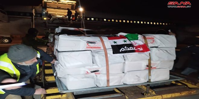 وصلت إلى مطار حلب الدولي الليلة الماضية طائرة إيرانية تحمل مساعدات إغاثية للمتضررين من الزلزال.