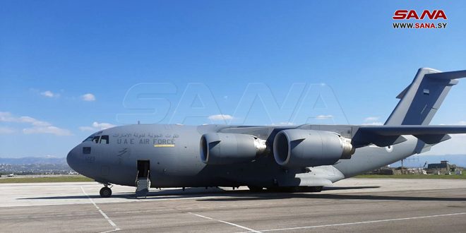 وصلت إلى مطار اللاذقية الدولي طائرة مساعدات إماراتية هي الثانية اليوم تحمل مساعدات إغاثية للمتضررين من الزلزال.