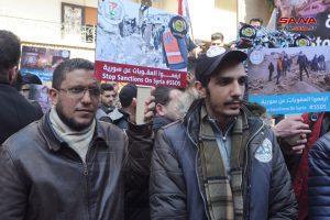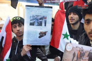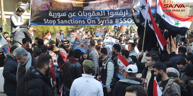 دعا طلبة جامعة دمشق والطلبة العرب الدارسون فيها خلال وقفة تضامنية نظمها الاتحاد الوطني لطلبة سورية اليوم، أمام مقر الأمم المتحدة بدمشق إلى الإنهاء الفوري للحصار والإجراءات القسرية أحادية الجانب المفروضة على سورية وشعبها منذ 12 عاماً.