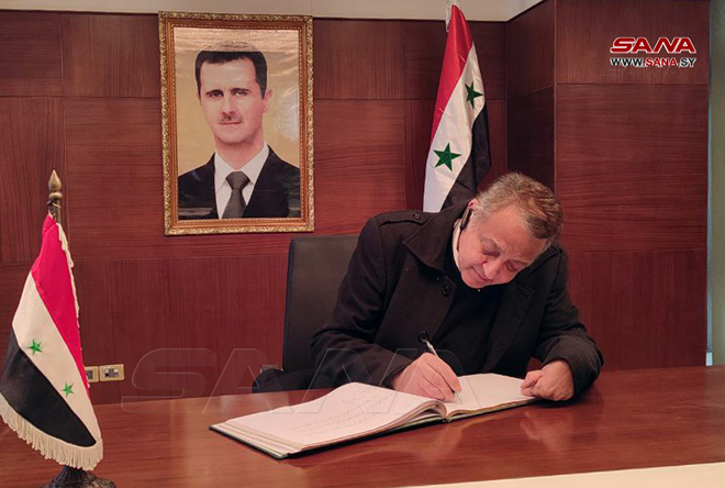 واصلت الشخصيات الرسمية والوفود الشعبية زيارة السفارات السورية في الخارج، لتقديم التعازي بضحايا الزلزال الذي وقع في سورية مؤخراً.